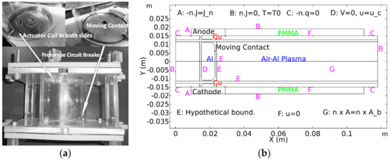 Moving contact (MC) is made from aluminum (Al), while the fixed contacts are made of copper (Cu). The initial gap between the electrodes is 2 mm. The wall of the chamber is made of transparent Poly-methyl-methacrylate (PMMA), known as plexiglass. The length of the arc chamber is 11 cm, and there are two pairs of open hatches at the bottom and the top of the chamber, as shown in Figure 1a. The moving contact is accelerated by the repulsive force generated by a Thomson drive. An appropriate two-dimensional geometry of FS, including the initial conditions, is shown in Figure 1b. The gravity acts in the negative direction of the X-axis. The sharpened edges of the contacts are bent. Avoiding sharp edges is essential in solving the flow and the heat transfer equations because the sharp points generate a very high current density in terms of numerical resolution, which results in very high-temperature spots, leading to an unrealistic heat and fluid flow. The gaps between fixed and moving contact and areas around contacts are the points with intense changes in the mesh shape, as well as in the value of the heat and fluid variables. Therefore, these areas are modified by two parallel lines, and rectangular boundaries are defined around the fixed and moving contacts as hypothetical boundaries, as shown in Figure 1b. These hypothetical boundaries allow for a smaller mesh in these areas, and secondly, help to solve the moving mesh by path definition. To calculate the arc parameters in the FS model, predefined variables must be calculated in the specific regions of each arc. Therefore, another hypothetical axial boundary is defined in the center of the model (y = 0), as shown in Figure 1b, which outlines the scope of the definition of variables for two series arcs in FS. Studies have shown that 2-D axisymmetric cannot be applied, even with significant simplifications because of two reasons: