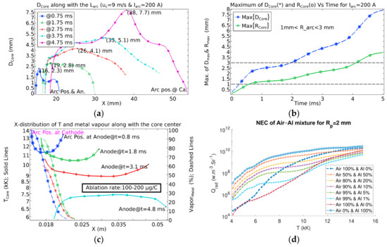 As it is shown in Figure 2b, the maximum radius of the core varies between 1 mm and 3 mm. So, the radiation absorption radius, Rp, for the NEC model is assumed 2 mm. The ablated mass for Cu electrode in low currents is calculated around 100–300 µg/C [57] and in our stationary study was around 316 µg/C [51]. Although the melting point of Al is half of Cu, its latent heat of evaporation is twice the Cu. Assuming a similar ablation rate will result in 150–300 × 10−3 cm3 Al vapor. By utilizing the particle tracing method [51], the ratio of Air-Al is calculated and it is shown along with the core center in Figure 2c, which complies with other studies [49]. According to [58], the influence of changing the arc radius from 1 mm to 10 mm on NEC for air plasma in the temperature range of 7–15k K is not significant, and its gradient by increasing the arc radius is negative. So, finding an average radius for the arc gives an accurate estimation of NEC. But according to [45], the influence of metal vapor percentage is enormous at this temperature range. So, metal vapor has been considered, and the arc radius was averaged. Based on the reported NEC of air-aluminium mixture [45] and temperature distribution in Figure 2c, NEC in the arc chamber is calculated through recursive studies to minimize the relative error.