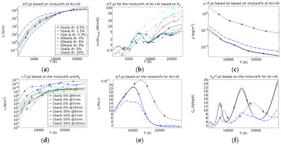 The main parameters of the utilized model are the transport and thermodynamic properties of gas mixtures, which would be obtained from the articles or could be calculated through chemical physics [59,60] for pressures and mixtures other than what is reported in the articles. Software packages handle these chemical physics calculations. Here, we used the PLASIMO® package [61], and the electrical conductivity, total heat conductivity, mass density, NEC, viscosity, and heat capacity of pure air and air-Al mixture at 1 and 20 bar at different mixture ratios and pressures are presented in Figure 3. The legends for all sub-figures are the same as Figure 3a.