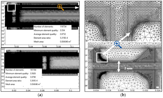 (a) Moving mesh with 119,734 elements in 43.48 cm2 at first and 161,164 elements at the end and (b) Extremely fine mesh defined around contacts and gap.