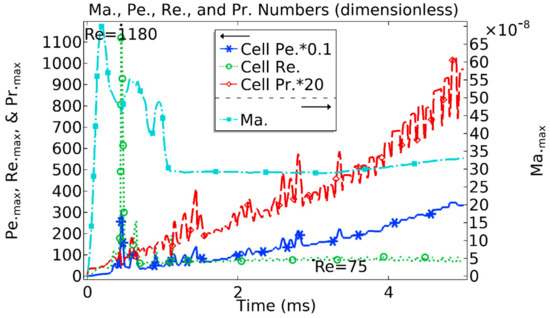 The maximum of Ma, Peclet number (Pe), Re, and Prandtl number (Pr), calculated in each cell of meshes for the whole of simulation time in an arc of 200 A, are shown in Figure 5. Ma is much less than 0.3. Pe, the product of the Re and Pr, is very large. The studied case is, however, similar to the flow inside a cylinder, where for 41 ≤ Re ≤ 103 an unsteady but predictable LF with counter-rotating vortices shed periodically from the cylinder is observed [81]. If Re > 103, vortices will be unstable, resulting in a turbulent wake behind the cylinder that is ‘unpredictable’ [81]. There is a transition to an entirely TF. As the stream begins to transfer to the turbulence regime, fluctuations appear in the flow, even though the inlet flow rate does not change with time. Then, it is no longer possible to assume time-invariant flow. So, it is compulsory to solve the time-dependent Navier-Stokes (TDNS) equations.