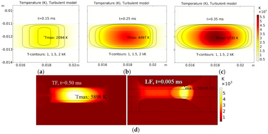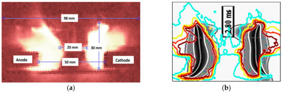 A low-frequency (f ≤ 100 Hz) arc on each half-cycle mirrors a direct current arc, the contact separation initiates the arc, and when the current reverses the electrodes interchange their roles as anode or cathode [84]. Simulated and measured arcs are not at the same cycles, so electrode positions are reversed. From Figure 9a, the arc starts with a Tmax of 14,790 K on both sides of FS from the sharp points of the contacts. Then it moves downward along the contacts and stays at its bottom because of the intense flow on it. When the arc comes out of the gap between the contacts, its T decreases up to 1000 K after 0.25 ms. Then it is elongated, but before 3.6 ms, its temperature is not reduced so much despite the current falling according to Equation (3), and it remains constricted. It is observed that the core is highly compact, hot, and luminous before 2.95 ms, and the arc boundary is more spacious than the core border.