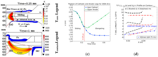 The arc is not in LTE in these two regions, and the NSE condition is not fulfilled. But simulated results are not so far from the measurements [24]. As it is shown in Figure 7a, arc sliding causes a hot trace at the contacts, which have a temperature range of 600–900 K based on Tcontact legend. As it is shown in Figure 7a, the arc temperature is higher than 10k K, i.e., the air is highly ionized, and the NSE assumption is valid. From 1 ms, as it is shown in Figure 7b, the arc is elongating between two points at the contacts. The arc root model is based on [76,83] and the temperature, current density, and voltage profile along the contour of Jmax in Figure 7d show the effect of this model.
