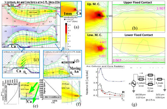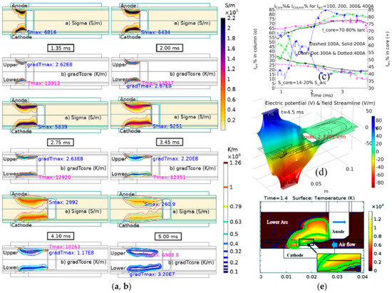 Figure 8a,b shows σ contours and the point of the maximum conductivity at 1.35, 2, 2.75, 3.45, and 5 ms in an arc of 200 A. The bright-dark part (green contour) is named core of arc. The rest of the arc inside the red contour is named arc column. The arc light is due to radiation that is proportional to T4. So, the arc column boundary is defined as σ = 1, which is equal to 3300 K but the core is the gliding section of arc (σ > 600, which is similar to 6700 K in air temperature) which is passing more than 80% of the arc current.