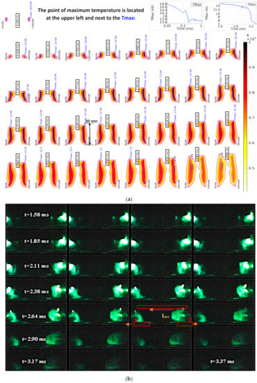 (a) Time-tagged simulated results of arc and core boundaries for two arcs in series, point of Tmax in 200 Apeak arc, and (b) High-speed imaging with 15,000 fps.