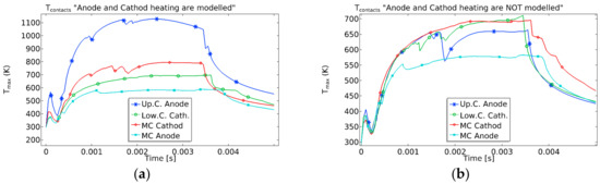 Thermionic emission acts as a heating source, and it is of crucial importance for contact temperature and ablation simulations, especially for the Cu cathode. The effect of modeling the electron emission from the cathode on the Tmax of contacts is compared in Figure 11. “C. Eff.” refers to the contact effect and means considering the thermionic emission in simulation. Considering thermionic emission, the temperature of the moving contract does not differ significantly, but as it is shown in Figure 11a the Tmax of the fixed cathode increases at 3.4 ms from 707 K in Figure 11b to 1103 K at 1.8 ms, while the Tmax of the fixed anode increases from 660 to 800 K. Contact erosion mostly happens near the fixed Cu cathode and then moving Al anode. It was modeled in detail and reported in other recent research [51] and it is also clear from Figure 12a.