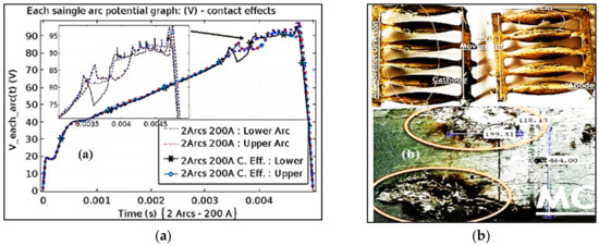Figure 12a compares the simulated voltage for two 200 A arcs with and without thermionic emission modeling. It reveals that the contact modeling in the first 3.5 ms has no significant effect on Varc for two 200 A arcs, but it affects the voltage in the last 1 ms. Anodic and cathodic Vds are modeled in both simulations. Figure 12b shows the melted/ablated points on fixed and moving contacts of the prototype switch. As predicted by the simulations, a trace of arc root is visible on the fixed cathode contact, and the most significant erosion happened at the lower part of the fixed contacts.