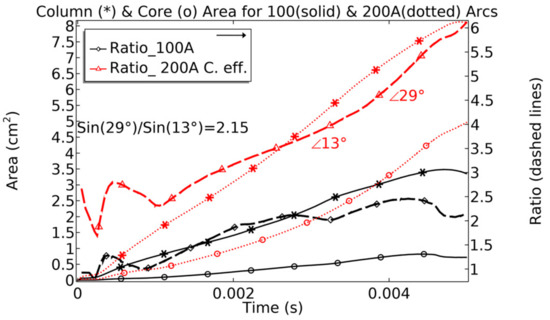 Figure 13 shows the influence of the arc mode change and its effect on increasing the core area. It shows the instantaneous area of the whole arc and its core, as well as the ratio of core-to-column area, for 100 and 200 A arcs with(out) thermionic emission modeling. The slope of the ratio increases suddenly by a factor of 2.15 for 200 A arcs between 2.95 to 3.83 ms, which is the time of change in the arc mode and means the core is not constricted any more. A single 100 A arc is simulated by applying to one of the fixed contacts. The arc area is smaller, but mode change happens in lower currents.