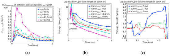 The simulated temperature distribution in the arc core and the contacts at two different times, 250 µs and 1 ms, are shown in Figure 7a to identify the dominant physical processes inside the arc during different phases of arcing. Up to 250 µs, the arc is sliding in the opposite direction of the moving contact (MC) displacement due to the cold air blowing at the arc column, (see Figure 7c). As it is shown in Figure 7a, in the first 250 µs, the arc length is constant, and the temperature distribution is almost homogenous inside the core, except for the anode and cathode regions. Therefore, the arc-elongating speed is zero before 250 µs.