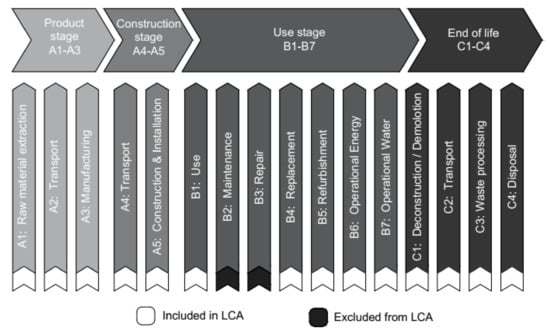 Figure 1 identifies the phases embedded in the system boundary of buildings according to the European standard EN 15978 [104]. Stages B2-B3, related to maintenance and repair services, were excluded from the analysis due to lack of sufficient data; however, they represent a negligible environmental effect compared to the remaining life cycle stages.