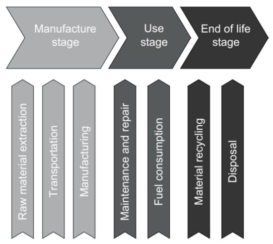 Regarding transportation vehicles, LCA system boundaries were defined according to the Environmental Product Declaration (EPD), developed in line with Product Category Rules (PCR) and the principles described in ISO 14025 [105]. The life cycle of vehicles can be divided into 3 main life stages: manufacturing, use phase and end of life. The system boundary applied to transportation vehicles is shown in Figure 2.