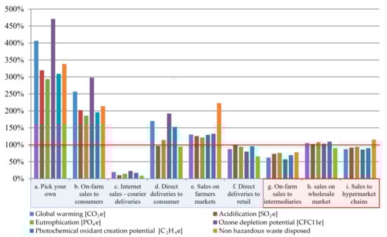 Gonçalves and Zeroual [43] and Mancini et al. [44] emphasize that the need for frequent, multiple deliveries of small quantities of products may have negative impacts on environmental sustainability; however, according to Bloemhof and Soysal [45], there are negative impacts, but they are “not so important”. The results of quantitative assessments of sustainability of short food supply chains from the study conducted within the Strength2Food (The European Union’s Horizon 2020 research and innovation project “Strengthening European Food Chain Sustainability by Quality and Procurement Policy” (grant agreement no. 678024)) project, although limited to transportation activities, prove that doubts concerning environmental benefits of SFSCs are fully justifiable [12].
