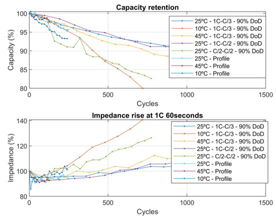 Additionally, a typical heavy-duty power profile scaled down to the cell level was applied at different temperatures in order to compare the aging across a range of the expected operating temperatures. This power profile consisted of 16 h of heavy-duty vehicle usage, containing discharging and charging current peaks, with an equivalent discharge of 85% DoD at the beginning of life. Then, the cell was charged at a C/3 rate to 4.15 V and kept at this voltage until the current was below 0.05 C. Finally, the cell rested for approximately 3 h to complete 24 h cycle with the discharge, charge, and rest period. The evolution of each battery capacity and impedance over the lifetime is visualized in Figure 1.
