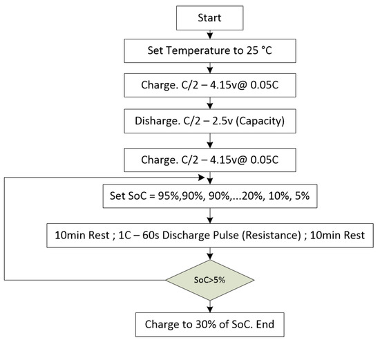 The aging check test (ACT) is visualized in Figure 2, it was designed to quantify BHI, and it was conducted at beginning of life, end of life, and in an interval of 4 weeks. Cell aging testing was finished when the cell capacity had decreased below 80% with respect to the initial value. In this work, the capacity and impedance are considered as the main health indicators, and therefore, the ACT was designed to obtain these values. In this sense, from each ACT, some parameters were extracted automatically such as the capacity, impedance at 1 C, and the OCV vs. SOC. To control the effect of the temperature on these measurements, the ACT tests were conducted within a climatic chamber at a constant temperature of 25 °C. To measure the capacity, firstly, a conventional charging step (0.5 C rate constant current until 4.15 V, constant voltage charge at 4.15 V until the current has decreased below 0.05 C rate) were applied. Then, a 0.5 C discharge until the minimum voltage of 2.5 V was performed in order to measure the current capacity, which was used to follow the evolution of the capacity over the lifetime. The resistances were calculated by applying a constant current pulse at different SOCs (95%, 90–10% in 10% steps and at 5%). At each SOC, a 60 s 1 C rate discharge pulse preceded and followed a 600 s rest period. The SOC change generated by this pulse during 60 s is 1.6%, which is not assumed to be big enough to consider impedance variation during this interval. For impedance rise identification, the 60 s discharge resistance R at 50% SOC was used for the aging analysis and tracking. This resistance value was calculated following Ohm’s law, with the measured voltage and current profiles during this pulse.