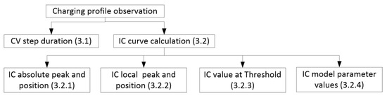 To evaluate the correlation between each charging profile indicator (CPI) and BHI, a systematic battery test extraction has been implemented from each ACT, which is exported in an Excel file with all the measurements (voltage, current, temperature) together with additional information about the test. Then, all these results are analyzed with a script developed in Matlab in order to analyze which CPI presents the best correlation to the BHI. A general overview of the workflow is visualized in Figure 3. Firstly, the work will start by analyzing the correlation between constant voltage (CV in Section 3.1) step time and capacity/impedance. Then, the work will focus on identifying the optimum IC curve calculation strategy from voltage and current measurements (Section 3.2). From this IC curve, the correlation between the absolute peak, local peak, value at voltage threshold (4 V), and model parameter with the aforementioned health indicators will be investigated in Section 3.2.1, Section 3.2.2, Section 3.2.3 and Section 3.2.4, respectively.