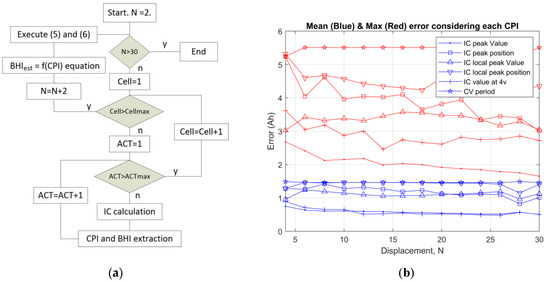 (a) Flowchart used to identify the optimum incremental capacity (IC) calculation strategy. (b) Mean and maximum error done correlating each charging profile indicators (CPI) to capacity for different displacement points N.