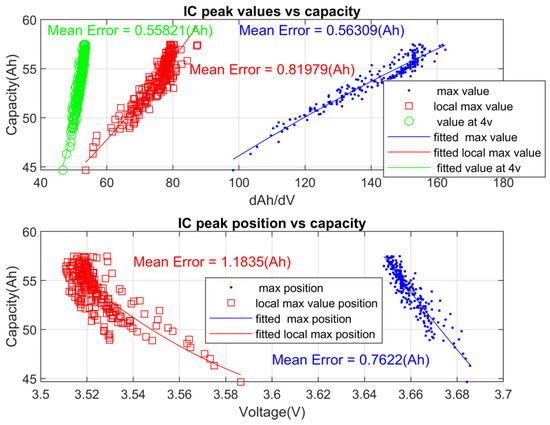 Similarly, the correlation found between the IC peak (blue) and local peak (red) position is plotted in a second subplot of Figure 6. In this chart, the capacity is visualized with respect to the voltages or the position of the absolute and local peaks. To find an equation that meets the real capacity considering the different peak positions, a similar optimization strategy is used. In this case, the mean and the maximum error values were found to increase up to 0.76 Ah and 1.18 Ah, respectively. Compared to the accuracy obtained from the IC peak and local peak error, the estimation made using the local peak was found to be less accurate.