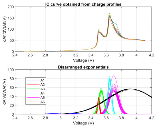 Following the steps defined in Section 3.2.4, each IC curve has been modeled by finding the optimum parameter model values for each disarranged exponential proposed in Equation (3). Taking into account the shape of the IC curve to model, a 6th-order IC model has been selected to fit with the real IC curve. Hence, a set of 18 parameters are found in each optimization (6 A, 6 V, and 6 ω) in order to minimize the real and modeled IC curves. As it has been previously mentioned in this work, the least square technique is used to find the optimum value of each parameter. The different IC curves and the evolution of each exponential curve are visualized in Figure 7. According to the experience acquired in this work, the maximum value of the IC curve was found to decrease proportionally to the capacity fade. In this sense, in the second subplot of Figure 7, the maximum value of the IC curve is modeled by the parameters A4 and A5, by observing the position of these two disarranged exponentials. The goal of this study is to identify if the representation of the IC peak using the model has the same correlation as the real IC peak value to the capacity.