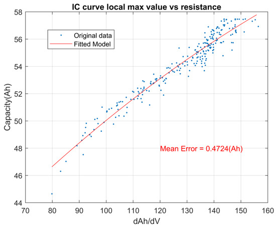 Figure 6 shows the correlation between the capacity and the CPI obtained from each ACT of each cell, which were aged according to the operation conditions defined in Table 2. Figure 6 shows the capacity vs. the measured maximum IC peak value in blue, the capacity vs. the local maximum value in red, and the value found when the cell presents a voltage of 4 V during the charging process in green. In a continuous line and at a corresponding color, the fitted equation is plotted using a second-order equation described in Equation (4). According to the results, a mean error value of 0.56 Ah was found using the maximum value, 0.81 Ah in case of the local maximum value, and 0.55 Ah using the value found at 4 V. For a new battery, the standard deviation could be larger than the indicated mean value. However, this deviation is reduced considerably when the capacity value is reduced, where estimation accuracy is more critical. The lowest error when estimating the BHI has been obtained using the maximum IC value, and therefore, the values found for the parameters C0, C1, and C2 in this case are visualized in Table 4. Some additional information is included in this table such as the parameters to calculate resistance considering the maximum IC value and the capacity/resistance using IC model parameters. The IC modeling results will be discussed in detail in Section 4.1.4 and Section 4.2.4.