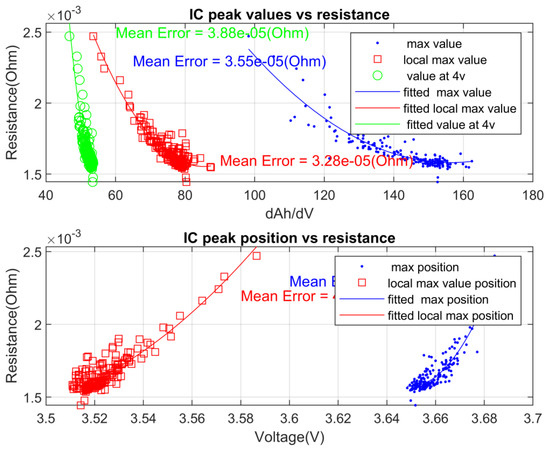 Figure 9 shows the correlation of the resistance vs. different measurements. The resistance with respect to the measured maximum IC peak value is plotted in blue, the resistance vs. the local maximum value (following the strategy defined in Section 3) is in red, and the value found when the cell presents a voltage of 4 V during the charging process is shown in green. The correlation found using Equation (7) is plotted in a continuous blue line. According to the results, a mean error value of 35 uOhm is found in the case of taking into account the maximum value, 32 uOhm in the case of a local max value, and 38 uOhm using the value found at 4 V. Taking into account the initial value of the inner resistance, this means a mean absolute error of around 2%. Unlike the capacity observation, the measureable indicator with the highest correlation to the resistance seems to be the local peak value, rather than the absolute value. However, due to the similar accuracy, the maximum and local peak values can be used for resistance estimation.