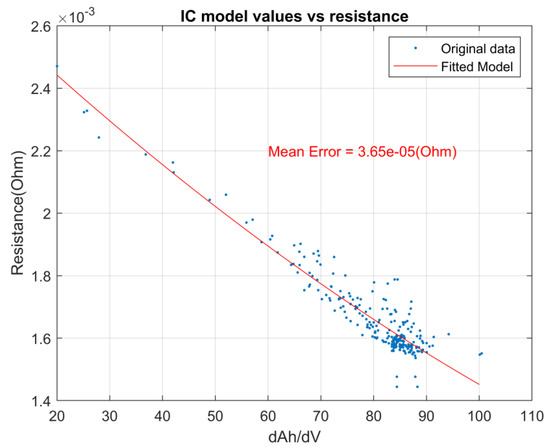 Using the previously obtained information, the highest correlation between the IC curve parameters and the cell inner resistance was obtained by tracking the evolution of the local IC peak value. Figure 10 shows the relation between the impedance rise vs. the sum of A2 and A3, since they represent the local maximum value of the IC curve. According to the result, the correlation between both of the indicators is very strong, and this information can be used again to estimate the resistance of the battery in real application. Additionally, Figure 10 shows the equation that describes this correlation in a continuous red line, using the second-order polynomial definition in Equation (7). This time, compared only to all cells’ response, the mean value of the absolute error done in resistance estimation has been found to be 36 uOhm, which is less than 2% with respect to the nominal resistance of this particular cell.