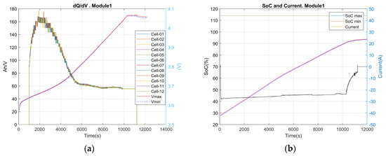The left side in Figure 11a shows the calculated IC curve by sampling the charging every 30 s and using a displacement of 30 between the two points used to calculate the IC. The IC calculation procedure defined in Section 3.2 has been used. In the right axis, the 12 cell voltages are visualized from 3.55 V to 4.07 V, approximately. Even though commercial elements were used to charge the module and to measure the cell variables, such as current and voltage, the IC result is very similar to the calculated one in the laboratory. In Figure 11b, the evolution of the current and state of charge of the 12 cells is visualized. The initial SOC is around 27%, and the module is charged to 95%.