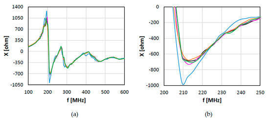 According to this, an indication can be obtained focusing on these peak values of and and, in particular, on the maximum values of and the minimum values of . Before carrying out the measurements, the calibration lines were built. Calibration lines for water–ethanol mixtures were obtained using water and 1-propanol with known permittivity values as references, so the measuring range was between 77.5 and 16 for , and between 6.32 and 1.24 for (values of the permittivity of the pure substances—water and 1-propanol, respectively) [41]. For the water–NaCl mixtures, instead, water and water–NaCl 0.1 N (0.584%) were chosen as the reference since the tests showed a flat trend of as the salt increased over this concentration, so it was not useful to utilize solutions with higher salt concentrations. Considering this, the measuring range, in this case, was between 77.0 and 76.0 for and between 59.28 and 1.24 for [41], but in this case, the interest was mainly focused on the imaginary part measure. In Figure 2 and Figure 4, we show that the R and X values of the water–ethanol solutions lie between those of the reference substances and that an increase of the ethanol concentration in the solution corresponds to a decrease of R (Figure 2), and to an increase of X. Similar conclusions can be formulated for NaCl–water solutions (Figure 3 and Figure 5).