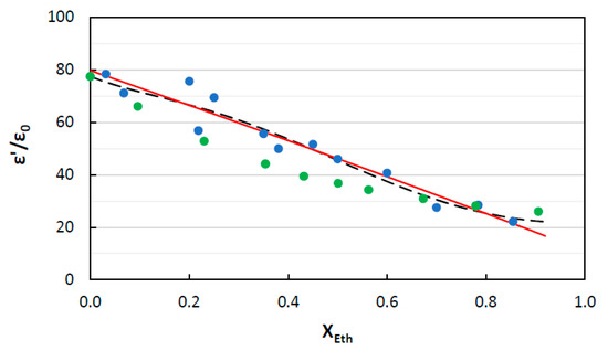 The Acree model is a thermodynamic derivation one that finds application in the prediction of mixtures properties like density, viscosity, surface tension, molar volume [50], and solute solubility in binary solvent mixtures [51]. In this case, it was used in the form given in the literature [52], where to calculate permittivity of a binary mixture with water and alcohol, as was done also by Jouyban [53], was used; therefore, this was the most appropriate to describe the dielectric properties of water–ethanol mixtures, at least. The model equations, respectively for water–ethanol (Equation (7)) and water–NaCl (Equation (8)) mixtures, are the following: