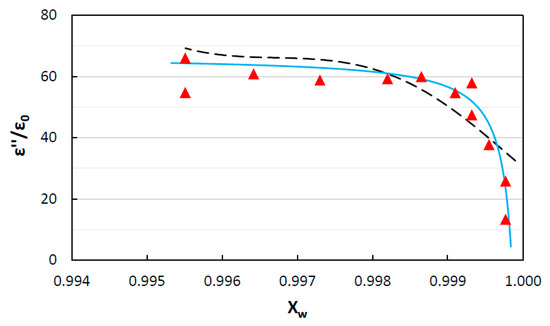 Figure 8 and Figure 9 report, respectively, the values of and of of the water–NaCl mixtures as a function of composition. An increase in the salt concentration leads to a slight decrease of the mixture dielectric constant and a quick increase of the mixture dielectric loss, which ends with a flatter trend for high values of NaCl molar fraction (higher than 0.001). In this case, the data were modeled with the Acree and the King and Queen models, with acceptable results, especially for the dielectric constant. Regarding the dielectric loss, the Acree model appears to be deficient in the description of the data, while the King and Queen one is better and also follows the plateau region that is reached at higher concentrations of NaCl.