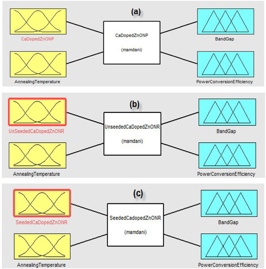 Fuzzy analysis of the Ca-doped ZnO nanoparticles (NP) and seeded and unseeded Ca-doped ZnO nanorods (NR)-based photoanodes have been performed using the MAMDAMI model. The fuzzy inference system (FIS) diagrams of the three samples are shown in Figure 2. Figure 2a shows the input of the first fuzzy analysis. The Ca-doped ZnO NP size and annealing temperature are taken as input. The effects of the two inputs are studied on the band gap and power conversion efficiency of the solar cell. Similarly, the effect of the diameter of the Ca-doped ZnO NR and annealing temperature are studied on the band gap and power conversion efficiency for seeded and unseeded substrates.