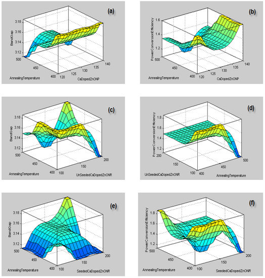 The ranges and membership functions are assigned to the respective inputs and outputs. The range for the input annealing temperature in all the three models is 400–500 °C. For Ca-doped ZnO nanoparticles, the range is 120–140 nm. For unseeded Ca-doped ZnO nanorods and seeded Ca-doped ZnO nanorods, the range for the input is 100–200 nm. The range for band gap was 3.1 to 3.2 eV, and for power conversion efficiency, the range is 1% to 2%. Then, rules for the memberships functions are added to the fuzzy simulations. The numbers of rules is based on the number of input. Figure 3 shows the 3D graphs for the respective Ca-doped ZnO nanostructure-based photoanodes. Figure 3a,b shows the effect of Ca-doped ZnO nanoparticles and annealing temperature on band gap and power conversion efficiency. Figure 3c,d shows the effect of unseeded Ca-doped ZnO nanorods and annealing temperature on band gap and power conversion efficiency. Figure 3e,f shows the effect of seeded Ca-doped ZnO nanorods and annealing temperature on band gap and power conversion efficiency. The increase in particle size and the nanorods diameter directly decreases the band gap. The effect predominantly appears due to the quantum confinement effect.