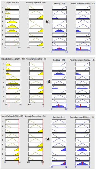 Rule Viewer: (a) Ca-doped ZnO NP; (b) Unseeded Ca-doped ZnO NR; (c) Seeded Ca-doped ZnO NR.