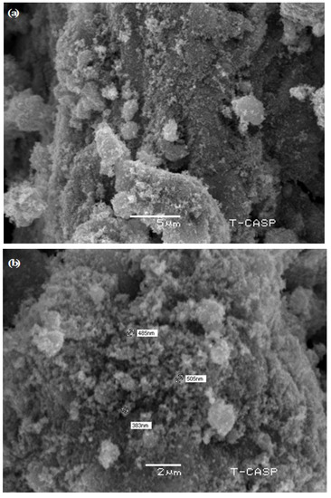 The scanning electron microscopy of the Ca-doped ZnO nanoparticles is shown in Figure 5. The figure confirms the formation of nanoparticles, which are agglomerated together to form a large cluster. The average nanoparticles size was estimated during SEM, which is in a range of 120–140 nm. The particles are joined together to form a cluster. The particles have a hexagonal geometry.