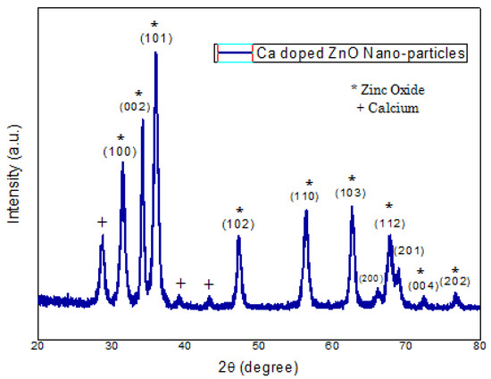 The XRD graph for the Ca-doped ZnO nanoparticles photoanodes is shown in Figure 8. The graph shows the presence of zinc oxide and calcium. The low-intensity peaks at 2ϴ = 29.51, 43.3, and 45.51 indicate the presence of calcium in the prepared Ca-doped ZnO nanoparticle photoanodes. The major peaks at 2ϴ = 31.7, 34.5, 47.58, 54.59, and 69.88 show the peak of ZnO with a wurtizle hexagonal structure of ZnO. The high-intensity peak of ZnO shows that the photoanode is commonly composed of ZnO. However, the small intensity peaks of calcium confirm the incorporation of Ca in the ZnO nanostructure and the formation of Ca-doped ZnO nanoparticles.