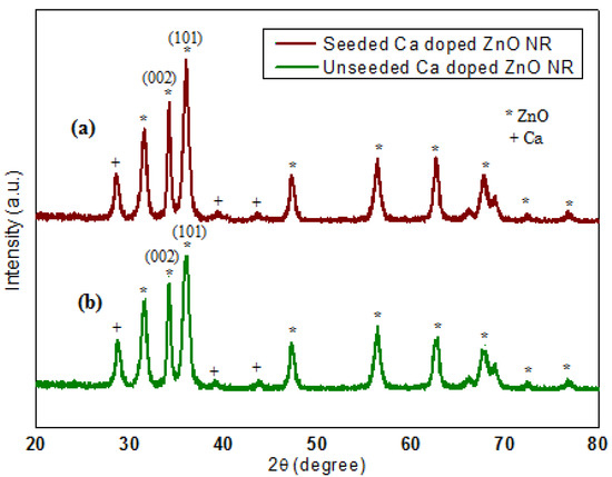 Figure 9 shows the XRD graph of unseeded and seeded Ca-doped ZnO nanorods using chemical bath deposition. The peaks of ZnO and Ca are in accordance with the Ca-doped ZnO nanoparticles. The intensity of the most dominant diffraction peaks of ZnO (002), (101), and (102) shows an increase in seeded substrate. This effect is due to the formation of more aligned and symmetric nanorods. The incorporation of Ca in the ZnO wurtizle hexagonal structure can also be confirmed using the XRD graph.