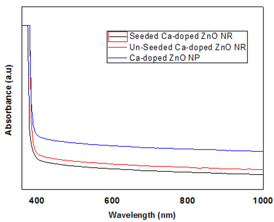 UV-Vis absorption graph of Ca-doped ZnO nanoparticles, unseeded nanorods, and seeded nanorods.