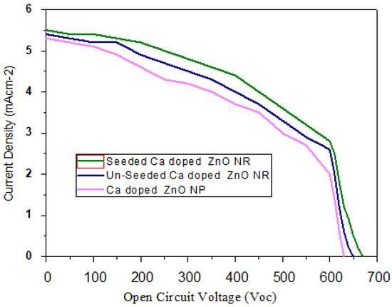 Photovoltaic characteristic plot of Ca-doped ZnO nanoparticles, unseeded nanorods, and seeded nanorods.
