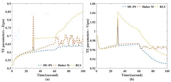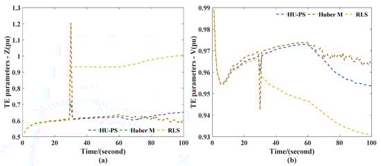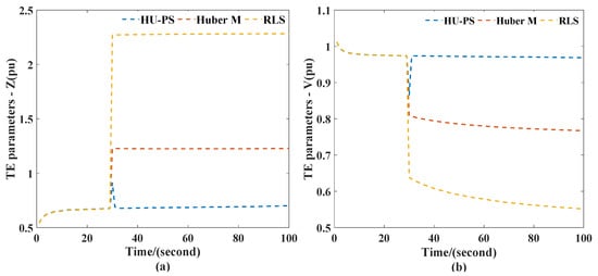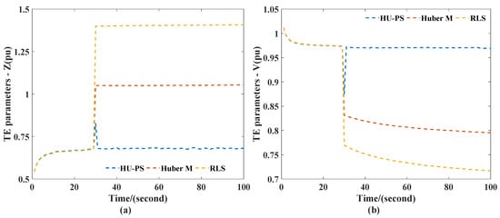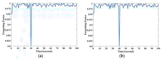 - Scenario 1: The voltage and current values at the 30th second increased to 4 times and 6 times, respectively, and recorded as the leverage measurement. A fixed forgetting factor was applied in Huber’s M-Estimation algorithm.