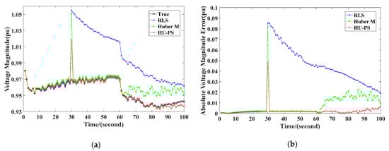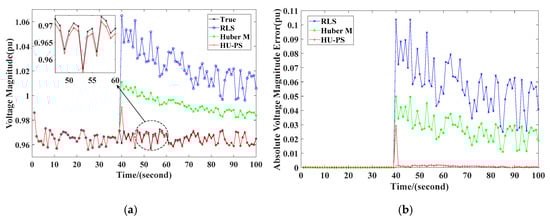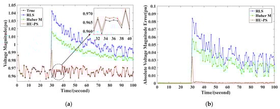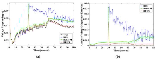 - Scenario 2: selected the values at the 30th second as the original values and increased them by 4 times as the outliers. VFF was used in the Huber’s M-Estimation algorithm. At the 60th second, the output of the generator of node 27 decreased.