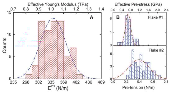 Elastic response test results. (A) Histogram of elastic stiffness. (B) Histogram of film pretensions. Dashed lines in both plots represent Gaussian fits to data. The effective Young’s modulus and prestress were obtained by dividing the graphite interlayer spacing Reproduced, adapted and reprinted with permission from Reference [23].