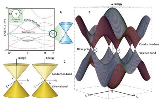 Band structure near the Fermi level of graphene. (A) 2D schematic diagram [39], (B) 3D schematic diagram, and (C) Dirac cone of K and K’, which corresponds to the Fermi level of (B). Reproduced, adapted and reprinted with permission from Reference [40].