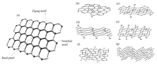 Graphene oxide (GO) is a graphene derivative rich in oxygens functional groups. It has epoxide and hydroxyl groups on its basal lattice, and aldehyde, carboxylic and ketone groups on its layer edge. Hence, GO is a material structurally rich in oxygen, carbon and hydrogen. Due to the fact that different methods are used to synthesize GO, its composition and non-stoichiometric structure are highly based on the production details [45]. Consequently, numerous studies has proposed several structures of GO, namely the Hofmann, Ruess, Scholz–Boehm, Nakajima–Matsuo, Lerf–Klinowski and Szabo models [46], as shown in Figure 3b–g.