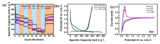 (a) Galvanostatic lithiation/delithiation curves, (b) Lithiation/delithiation voltage profiles and (c) cyclic voltammetry curves of semi-coke derived graphene anode measured at a scanning rate of 0.5 mV s−1. Reproduced, adapted and reprinted with permission from Reference [77].