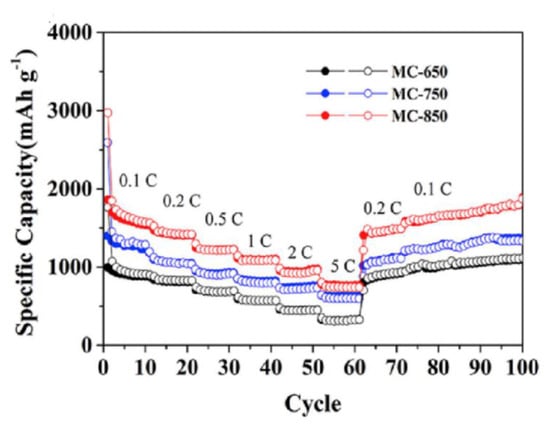 Zhong et al. [77] converted anthracite and semi-coke into multilayer graphene spheres using nickel as catalyst at relatively low temperature. The related anode materials for LIBs showed good reversible capacity of 401 mAh g−1 at 0.1 Ag−1 as clearly evidenced from Figure 4.