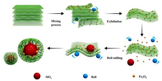 Production scheme of Fe3O4-pillared onto SiOx microspheres and wrapped by graphene. Reproduced, adapted and reprinted with permission from Reference [94].
