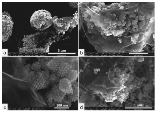 Perreault et al. [131], recently developed a straightforward engineering nanostructuring strategy for the preparation of mesoporous Cu–Ni oxide-nanocast composites with exfoliated graphene. Actually, an efficient spray drying technique was exploited to prepare a composite in which mesoporous mixed copper/nickel oxide nanoparticles are intimately enwrapped by exfoliated graphene layers. It resulted in 3D porous microspheres where mesoporous transition metal oxide nanostructures are wrapped by graphene that confines them also forming a continuous conductive network, as shown in Figure 8.