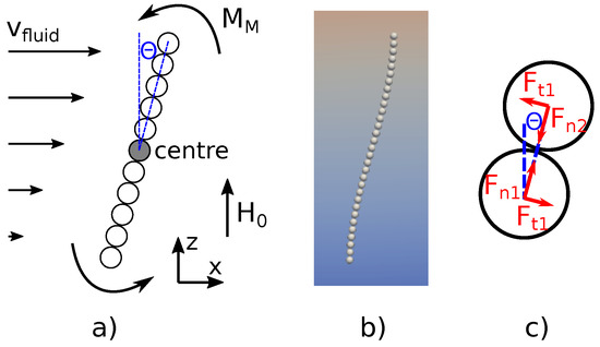 Suppose that initially the chain is vertical and the particles have zero velocity. The fluid then starts to move the chain to the direction x due to the drag force. However, as the fluid has a strain rate, the drag force at the top of the chain is higher than at the bottom section, which causes the chain to start to rotate. As the chain rotates, a counter magnetic torque between the neighboring particle pairs appears due to the magnetic particle–particle interaction. This can be seen more clearly if Equation (8) is rewritten with its tangential and normal components: