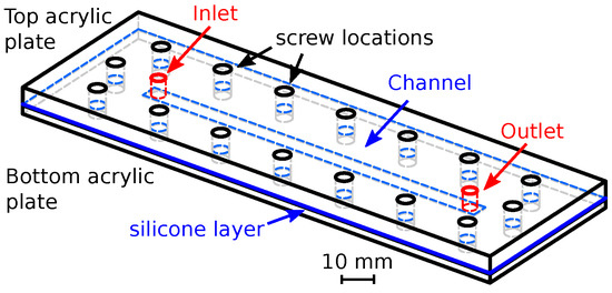 The schematic of the microfluidic chip. The rectangular channel was cut in a thin, approximately thick silicone layer. The top and bottom surfaces were encapsulated by 4 and 2 thick acrylic plates, respectively. The layers were held together by screws. The channel had a width of 4 . The inlet and outlet ports were drilled through the top acrylic plate.