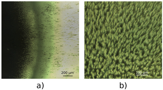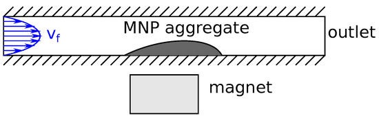 A two-dimensional simulation was prepared, assuming planar flow in the channel. Although treating the problem in 2D leads to some inaccuracies about the aggregate shape, the computational cost is significantly reduced compared to a 3D case. The simulation domain was a × rectangular domain. The sketch of the simulation domain is shown in Figure 7. At the bottom wall, which was close to the magnet the local magnetic torque density, the MNP phase viscosity was increased to a four-times-higher value compared to Equation (14) according to the discussion of the linear chain model. The fluid phase was water with the density of ρb = 997 kg·m−3 and the viscosity of μb = 8.9 × 10−4 Pa·s