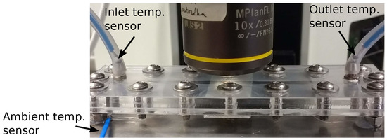 In order to verify our model with measurements, first we created a microfluidic structure. The requirement for the device was to be opaque, enabling us to observe the nanoparticle aggregate with a microscope during the aggregation. To reach this goal a unique microfluidic chip was manufactured, which basically consisted of a thin silicon layer between two opaque acrylic plates. The acrylic layers gave the mechanical stability while the silicon layer ensured the sealing. The sketch of the device is shown in Figure 2, while a photo of the device during a measurement is shown in Figure 3. The microfluidic channel was a long rectangular domain, which was cut in the silicon layer. The channel had a uniform width of 4 and its total length was 85 . The thickness of the silica layer, i.e., the height of the channel, was . The three layers were held together by densely placed screws around the channel. The inlet and outlet ports of the channel were drilled through one of the acrylic plates. All the three layers, including the shape of the microchannel, were prepared with laser cutting. The final structure was found robust and stable even after a several days of usage.